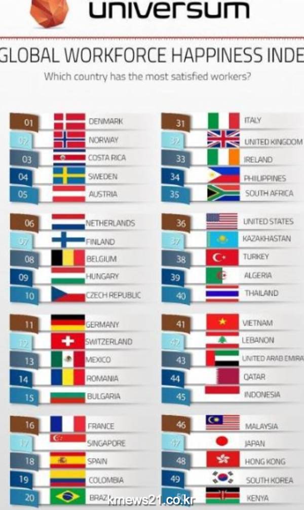 글로벌 리서치 기업인 스웨덴의 '유니버섬(Universum)'이 전 세계 57개국의 젊은 직장인 20만 명을 대상으로 직장인 행복지수를 조사한 결과 한국은 최하위권인 49위에 머물렀다.
