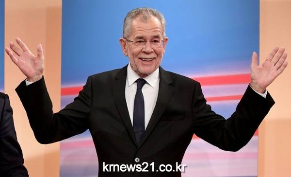▲ APA/AFP / HARALD SCHNEIDER [제공자ⓒ 뉴스21통신. 무단전재-재배포 금지.]오스트리아 대통령 선거에서 승리한 판 데어 벨렌은 TV트레이에서 자신의 승리를 기념하고 있다.
