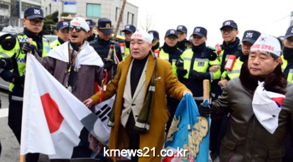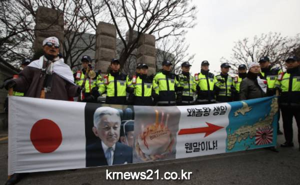 이들은 '왜놈왕 생일 웬말이냐', '일본군 위안부 20만명, 여기에 오고 싶니'라는 문구 등이 적힌 피켓을 들고 구호를 외치다가 경찰의 제지를 받기도 했다.