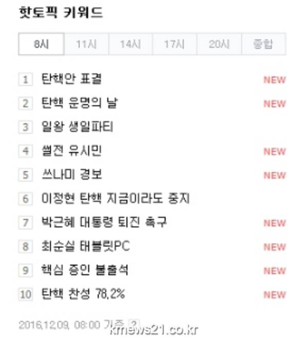 국내 주요포털과 인터넷 게시판 등에서도 오늘은 탄핵에 네티즌들의 관심이 집중되고 있다. 9일 오전 8시~9시 기준으로 네이버의 핫토픽 키워드는 1위부터 10위까지 대부분 탄핵과 관련된 키워드가 차지하고 있다. 키워드를 보면 ▲탄핵안 표결 ▲탄핵 운명의 날 ▲이정현 탄핵 지금이라도 중지 ▲ 박근혜 대통령 퇴진 촉구 ▲ 최순실 태블릿PC ▲ 핵심 증인 불출석 ▲탄핵 찬성 78.2% 등 10개 중 7개가 탄핵과 국정농단 관련 키워드로 도배돼 있다. 네이버 실시간 급상승 검색어 또한 마찬가지다. 오전 8시 50분 기준으로 ▲노무현 탄핵 이유 ▲ 가결 ▲ 노무현 탄핵 ▲ 탄핵 ▲ 썰전 ▲ 탄핵 표결 시간 ▲ 황교안 ▲ 전여옥 등 1위부터 10까지 모두 정치 이슈로 가득 차 있는 이례적인 상황이 벌어지고 있다.