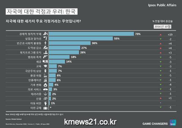 한국의 경우 최순실 게이트와 박근혜 대통령 탄핵 이슈로 지난달과 비교해 ‘경제적 정치적 부패’에 대한 부정적 인식이 19%포인트 대폭 상승한 73%로 나타났다. 다음으로 ‘실업과 일자리’(55%, 전월대비 -2%p), ‘빈곤과 사회적 불평등’(36%, 전월대비 +4%p) 순으로 나타났다.