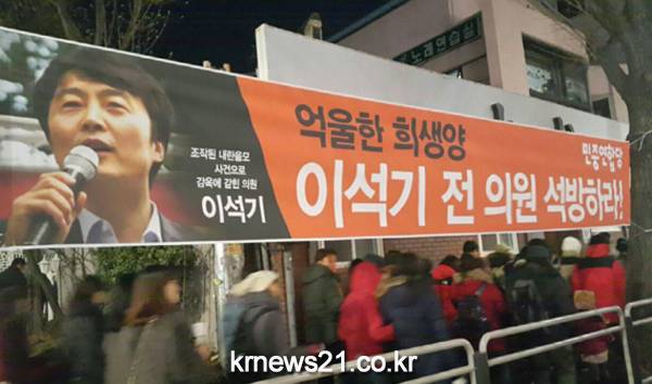 경복궁역 사거리에선 아예 방송차까지 동원해 "이들은 1년 먼저 촛불을 들었을 뿐 억울한 희생양"이라고 목소리를 높였다. 플래카드를 내건 주체는 원외좌파정당 '민중연합당'으로, 당원과 당 지도부 대부분이 해산된 통진당 출신인 것으로 알려졌다.