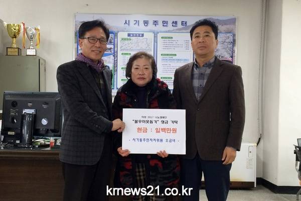 시기동주민자치위원회 오금녀위원이 지난 12일 이웃돕기 성금 100만원을 시기동주민센터에 기탁했다.