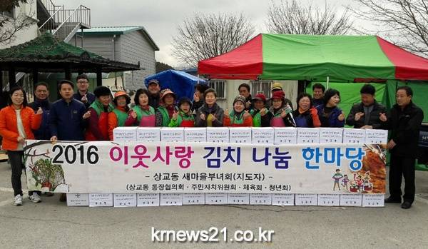 상교동 새마을부녀회가 주최하고 주민자치센터와 주민자치위원회, 이통장협의회, 청년회 등이 후원한 ‘사랑의 김장김치 담그기 행사’가 13일부터 14일까지 상교동주민센터 광장에서 열렸다.