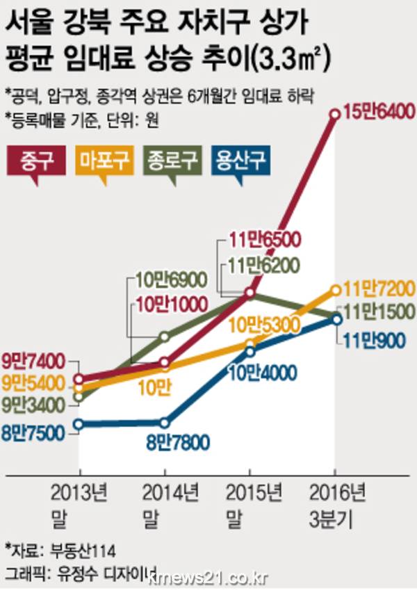 경기침체에도 상가 임대료가 단기 급등하면서 영세 자영업자들이 고통받고 있다. 저성장, 저물가가 장기화하고 올 들어 청탁금지법 시행, 박근혜·최순실 국정농단 사태에 따른 불확실성 고조로 소비심리가 얼어붙은 것과는 별개로 상가 임대료는 고공행진 중이다. 치솟는 임대료와 상권 양극화 실태를 짚어보고 임대인·임차인 간 상생협약 등 대안의 실효성과 해결책을 모색해본다.
