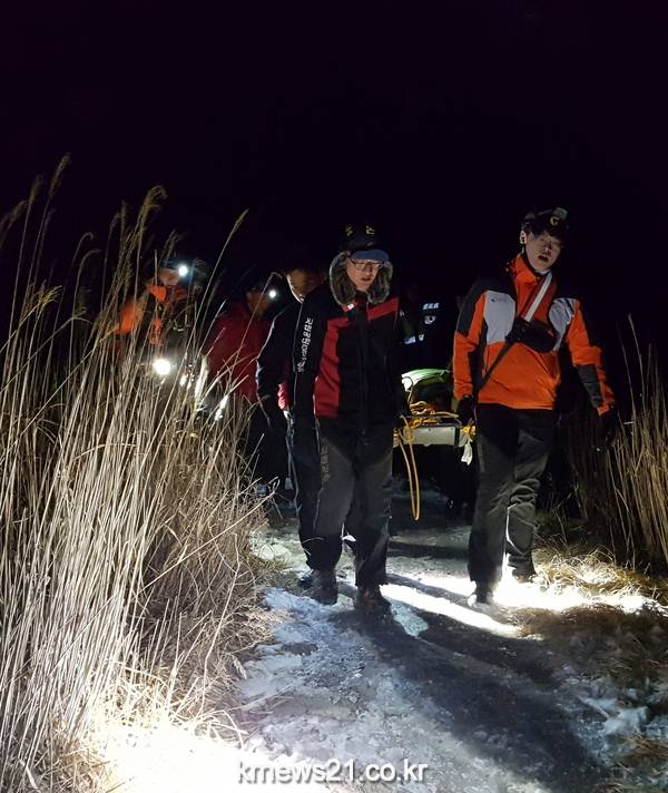 구조대원들은 저체온증으로 힘들어하는 오 씨를 침낭으로 신속하게 보온조치하고 응급처치를 한 후 들것으로 구급차가 있는 중봉까지 이동해 안전하게 인근 병원으로 이송했다.
