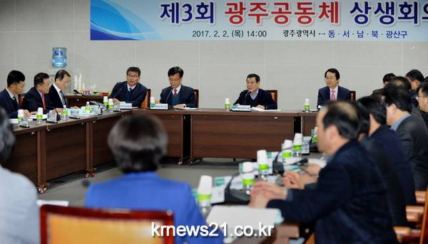 광주광역시는 2일 시청 3층 중회의실에서 시와 자치구 간 교류협력을 위한 ‘제3회 광주공동체 상생회의’를 열고, 2017년도 자치구 주요업무 계획을 공유하며 현안사업들에 대한 의견을 나눴다.