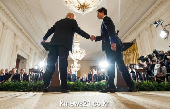 도널드 트럼프 미국 대통령과 저스틴 트루 두 총리와 백악관 공동 기자 회견에서 악수 하고 있다