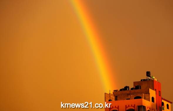가자도시 위에 무지개가 나타난 모습이다