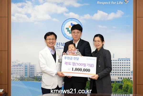 강명재 병원장은 “따뜻한 마음과 정성으로 전북대병원을 찾아 준 가족 모두에게 감사드리며 백일을 맞은 도경군이 우리 사회에 꼭 필요한 동량으로 건강하게 자라길 바란다”고 표한 뒤 “이번에 전달된 비용이 저소득아이들의 진료비로 소중하게 쓰일 수 있도록 하겠다”고 말했다.