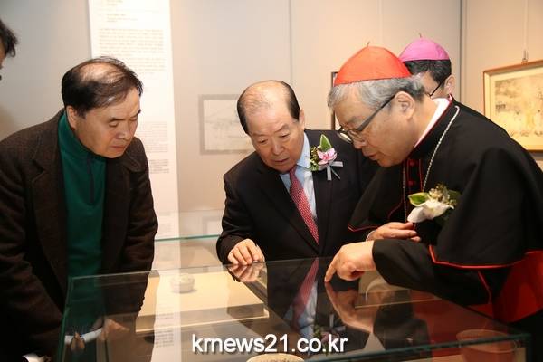 [사진 2] : 3월 25일 오전, 박홍섭 마포구청장(가운데)이 2017 절두산순교성지 축성 봉헌50주년 수집유물 특별전 개막식에 참석해 염수정 추기경(오른쪽)및 관계자들과 함께 유물에 얽힌 내용에 관해 이야기를 나누고 있다.