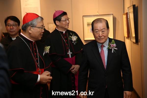 [사진 3] : 3월 25일 오전, 박홍섭 마포구청장(오른쪽)이 2017 절두산순교성지 축성 봉헌50주년 수집유물 특별전 개막식에 참석해 염수정 추기경(왼쪽 앞)및 관계자들과 함께 전시회를 둘러보고 있다.