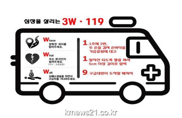 3W는 ‘where-정확한 환자 위치, what-환자 상태 어떤지 침착하게, wait-심폐소생술 하면서 구급차 기다려 달라’는 의미를 담고 있다.