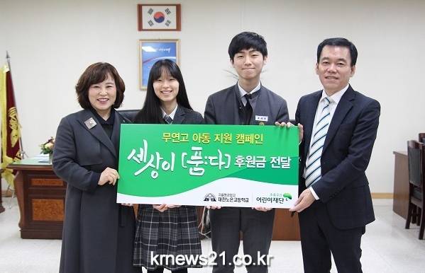 대전노은고(교장 김승태)는 6일 유성구 노은동에 위치한 대전노은고에서 김승태 대전노은고등학교장과 고은영 학생회장, 박미애 초록우산어린이재단 대전지역본부장과 관계자가 참석한 가운데 무연고 아동 지원을 위한 후원금 30만원 전달식을 가졌다.