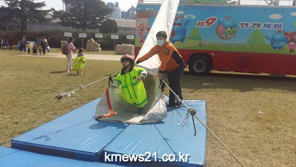▲ 글·그림 축제와 함께한 소방안전체험이날 전주덕진소방서는 소방안전 이동체험차 등 3대의 소방차량과 직원 및 자원봉사자를 포함 20여명의 인원이 심폐소생술 실시요령 교육과 병행하여 응급환자 발생대비 응급의료소를 운영하였다. 행사에 참석한 초·중학생들은 다양한 소방활동 체험과 관련 이동안전체험차량을 이용한 지진체험 및 대피체험, 경사하강식 구조대 등을 통하여 짧은 시간이지만 아이들과 더욱더 안전에 대해 공감하는 시간을 가졌다.