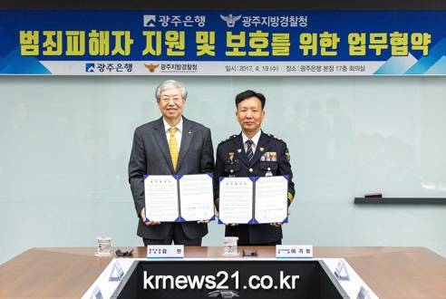 광주은행은 19일 본점 17층 회의실에서 광주지방경찰청과 범죄피해자 지원과 보호를 위한 업무 협약식을 했다.