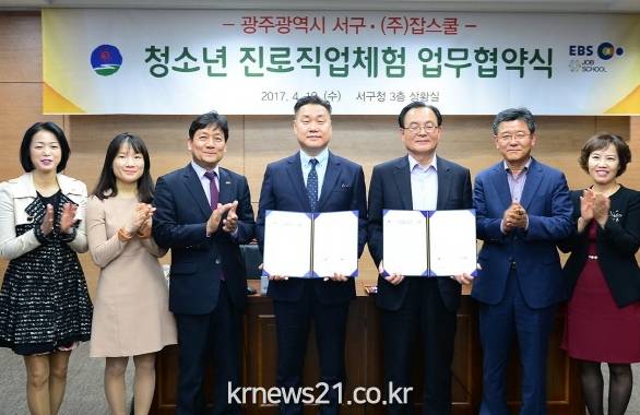 광주 서구(구청장 임우진)와 ㈜잡스쿨(대표 김정훈)이 지난 19일 청소년 진로직업체험 활성화를 위한 상호 업무협약을 체결했다.