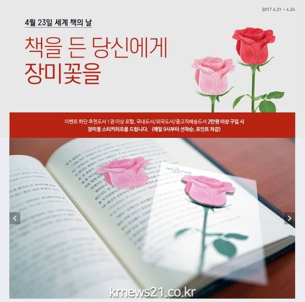 예스24는 세계 책의 날을 맞아 온라인과 중고서점에서 장미꽃을 나눠준다. 21일부터 24일까지 예스24 홈페이지에서 책을 소개하는 도서 등 추천도서를 포함해 2만원 이상 도서를 구매하는 고객에게 장미꽃 모양의 스티키리프를 증정하고 세계 책의 날 당일인 23일에는 예스24 중고서점 강남점과 목동점, 부산 서면점 3곳에서 각각 구매고객 선착순 1천명에게 비누장미꽃과 기념 카드를 준다.