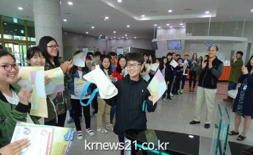 체험관은 이날 오전 9시 40분께 10만번째 방문객인 구평초등학교 6학년 강민기 학생에게 기념품을 전달했다.