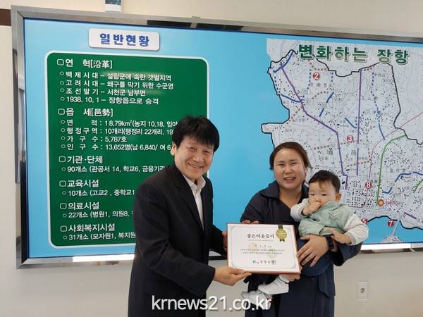 26일 행정복지센터를 직접 찾아온 김지후(30세, 장항읍 창선2리)씨는 자녀 한승현의 첫돌 기념으로 아기를 키우는 소외된 계층에