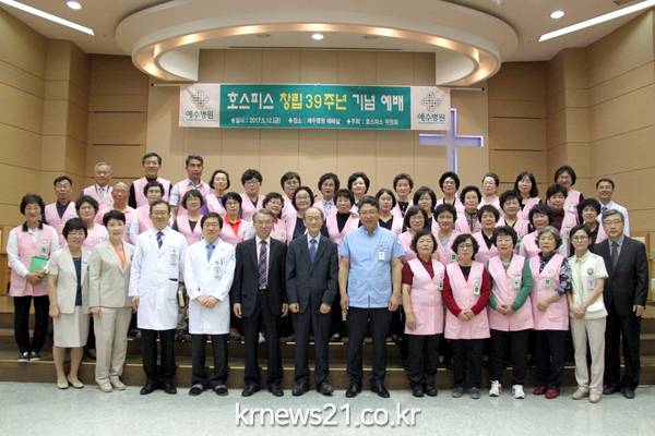 5월 12일(금)에 예수병원 4층 예배실에서 예수병원 호스피스 39주년 기념예배가 있었다. 예수병원 호스피스 위원장인 정선범 목사의 사회로 호스피스 자원봉자자 46명의 합창과 서머나 교회 봉상태 목사의 ‘기억’ 이라는 주제로 설교가 있었다.