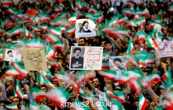 이란의 대통령 후보 인 에브라함라지의 지지자 들은 이란의 수도에서 에브라함 지지캠페인 집회에 참석한 모습이다