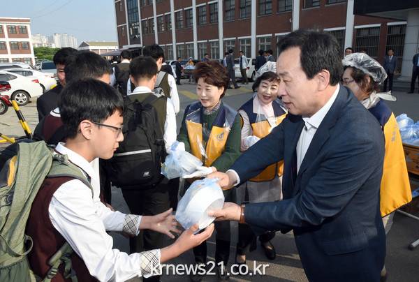 박홍률 목포시장을 비롯한 목포시 공무원, 여성단체회원 70여명, 학부모 등이 참여해 이른 새벽부터 정성껏 준비한 주먹밥을 학생들에게 나눠주며 아침식사 및 건강한 먹거리 섭취의 중요성을 당부했다.