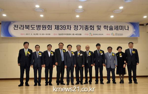 전라북도병원회(회장 강명재 전북대학교병원장)가 지난 18일 전북대병원 임상연구지원센터 2층 새만금 홀에서 제39차 정기총회 및 학술세미나를 개최했다. 이날 행사에는 강명재 전라북도병원회장 등 병원회 소속 회원과 홍정용 대한병원협회 회장을 비롯한 병원협회 관계자 등 관계내빈 100여명이 참석한 가운데 진행됐다.