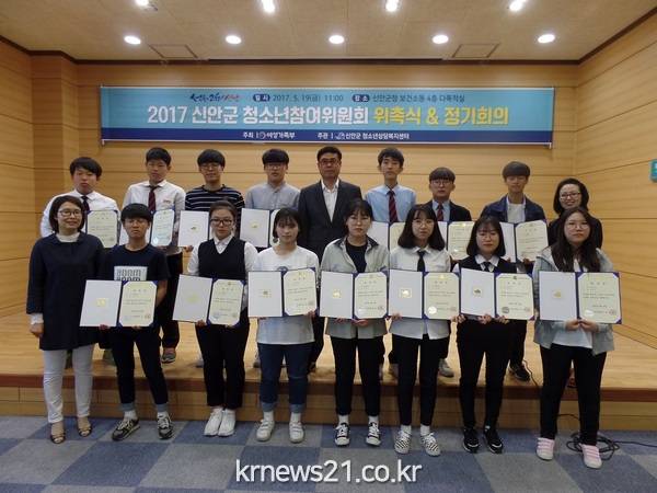 신안군은 지난 5월 19일(금), 신안군청 다목적실에서 18명의 청소년들이 참석한 가운데 2017년 신안군 청소년참여위원으로 위촉하고 정기회의를 개최했다고 밝혔다.