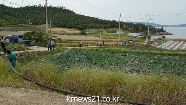 민관합동 가뭄대책반을 구성하여 지도 태원농장 하천 용수를 효지들녘(유동, 연화동)까지 약5km 거리에 다단양수작업을 실시하여 생육부진 지역과 모내기 미 실시지구 약 74.7ha 들녘에 용수를 공급하고 있다.