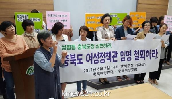 개방형 직위인 충북도 여성정책관의 공무원 임용을 둘러싼 지역 여성계의 반발이 수그러들지 않고 있다. 충북여성연대와 충북여성정책포럼 소속 여성단체 회원들은 7일 도청에서 기자회견을 열고 "여성정책관의 임명을 철회하라"고 촉구했다.