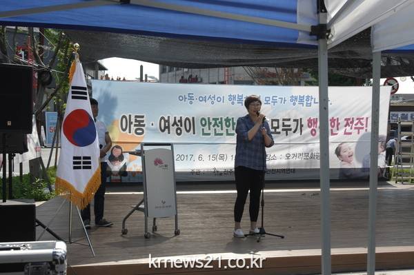 민·관 협력기관으로 구성된 전주시 아동·여성안전 지역연대가 폭력추방을 통해 아동과 여성이 안전한 전주를 만들기 위한 전주시민 문화행사를 열었다. 전주시 아동·여성안전 지역연대는 15일 오거리문화광장에서 지역연대 위원과 여성폭력 예방시설 종사자, 완산·덕진경찰서 관계자, 전주시여성단체 관계자, 지역아동센터연합회 관계자, 학생, 시민 등 500여 명이 참석한 가운데 폭력추방 문화 행사를 개최했다.