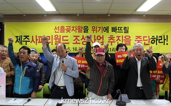 제주시 조천읍 선흘1리마을회는 16일 제주도의회 도민의 방에서 기자회견을 열어 "제주 고유의 숲인 곶자왈에 제주와는 전혀 어울리지 않는 동물들을 풀어놓는 관광시설을 짓겠다는 발상이 황당무계하다"며 "이는 선흘곶자왈의 가치를 현격히 떨어뜨리는 것은 물론 생태계 교란도 불 보듯 뻔하다"고 주장했다.