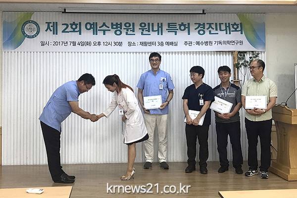 예수병원은 의료질 평가 중 연구개발영역 평가를 대비하고 직무발명 관련하여 아이디어를 제공한 자에게는 포상을 하여 사기를 진작시키고자 지난해부터 특허경진대회를 개최하고 있다. 지난해 1차 특허경진대회는 7건 특허 출원, 2건 심사 중, 5건 등록 완료 등 큰 성과를 얻었다