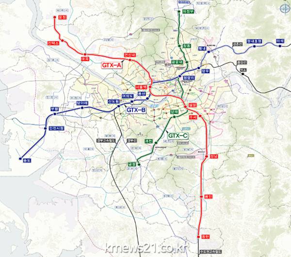 광역급행철도망(GTX)은 총 211km로서 파주와 동탄을 잇는 A노선(83km)과 송도와 마석을 연결하는 B노선(80km), 의정부와 금정을 잇는 C노선(48km) 등 3개 노선을 서울역, 청량리역, 삼성역을 주요 거점으로 해 방사형으로 교차되도록 구축할 계획이다.