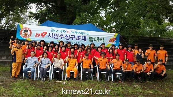 전주덕진소방서는 2017. 7. 10(월) 완주군 고산면 고산천 오성교 둔치에서 소방공무원, 의용소방대원, 자원봉사자, 유관기관 등 70여명이 참석한 가운데『119시민수상구조대』사전 교육·훈련 및 발대식을 가졌다. 이들 119시민수상구조대는 때이른 불볕 더위가 6월부터 연일 계속 되면서 물놀이 주말 이용객 증가에 따라, 7월 10일부터 8월 18일까지 본격적 으로 고산천을 찾는 피서객들의 물놀이 안전사고 예방과 순찰, 부상자 발생 시 응급처치 및 신속한 구조활동 등을 펼치며 여름철 물놀이 안전지킴이 역할을 수행하게 된다.