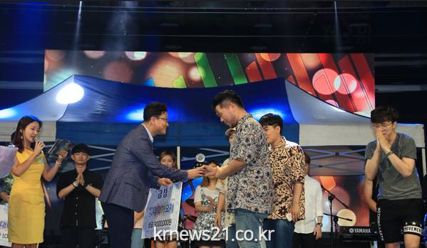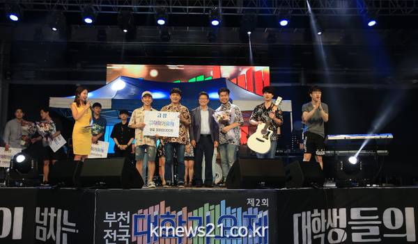 이날 부천마루광장에서 부천전국대학가요제 본선이 열려 예선을 거친 최종 12개 팀이 기량을 펼쳤으며, 강 의장은 금상을 수상한 ‘Purple Jean’ 에게 상패와 부상을 수여하고 축하했다.