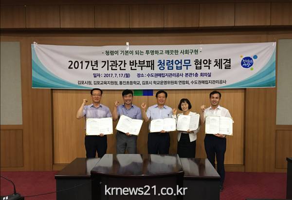 김포시가 지난 17일 수도권매립지관리공사 1층 대회의실에서 기관 및 민간단체간 반부패 및 청렴문화 확산을 위한 상호 업무협약(MOU)를 체결했다.