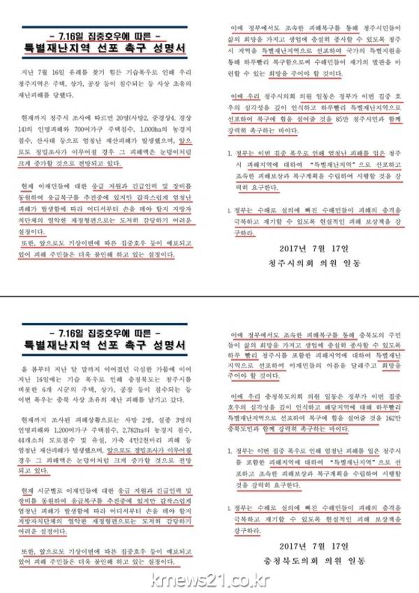 도의회는 성명서를 통해 “지난 16일 기습 폭우가 충북 사상 초유의 재난 피해를 남기고 갔다”며 “정부는 피해지역을 특별재난지역으로 선포해 이재민들의 아픔을 달래주고 희망을 줘야한다”고 촉구했다.