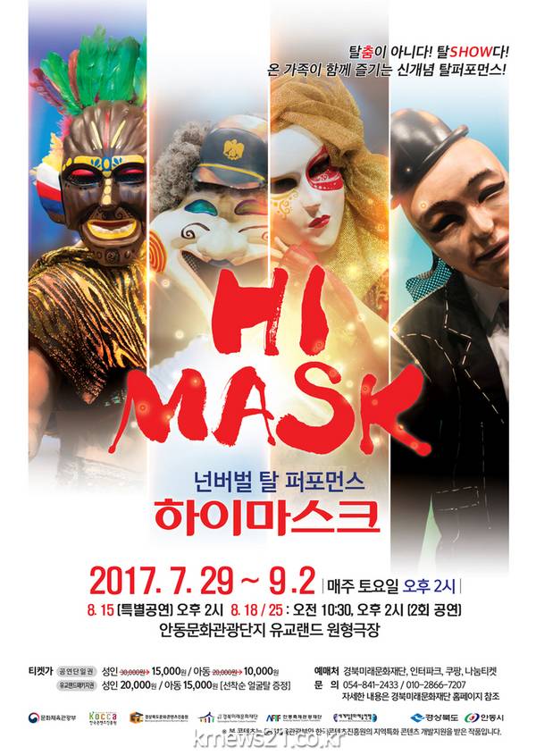 ‘HI MASK’는 2015년 전통과 재미를 접목한 글로컬(Glocal) 공연문화콘텐츠로 인정받아 지난 6월 ‘2016 지역특화융복합콘텐츠개발사업(기 개발 과제 연계 콘텐츠)’에 추가 선정돼 경북문화콘텐츠진흥원 주관하에 (사)경북미래문화재단, 안동축제관광재단, 세계탈문화예술연맹과의 컨소시엄으로 추진한 사업으로 세계의 탈과 안동의 탈을 접목해 새로운 가치를 만들어낸 넌버벌 공연 콘텐츠이다.