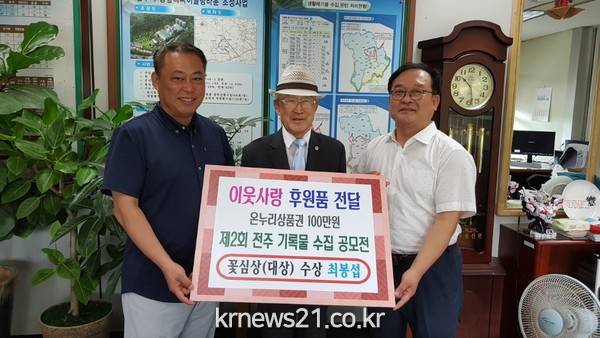 전주시는 전주민간기록물 공모전에서 대상(꽃심상)을 받은 전주향친회 회장 최봉섭씨가 소외된 이웃을 위해 써달라며 시상금 전액 100만원을 기탁했다고 밝혔다. 최 씨는 지난 6월에 실시한 공모전에서 1920년~1960년대 전주의 일대기를 담은 여러 기록을 기증해 대상을 수상했다.
