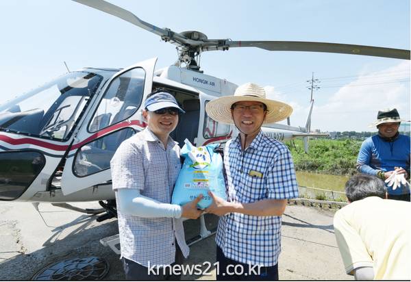 항공방제 첫 날인 25일 유영록 김포시장은 통진읍 수참리 항공방제 현장을 방문해 관계자를 격려하고, 김포금쌀의 안정적인 생산과 농업인의 소득증대를 위해 철저히 방제할 수 있도록 주문했다.