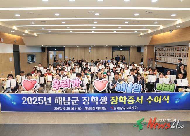 재단법인 해남군교육재단(이사장 명현관)은 지난 28일 해남군청 대회의실에서 2025년 해남군 장학생 장학증서 수여식을 가졌다.수여식에서는 2025년 각 분야 해남군 장학생으로 선발된 우수학생 474명에게 총 4억 5,500만원의 장학금을 지원한다.이날 수여식에는 장학생 대표 78명과 관계자들이 참석하여 자리를 빛냈다. 식전 공연으로 예체능 분...