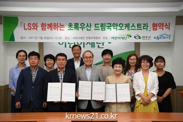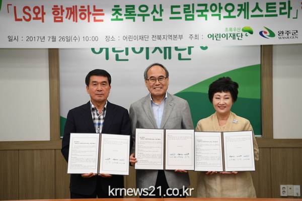 27일 완주군은 초록우산어린이재단(전북후원회장 서거석), 전통문화마을(이사장 김진형)과 ‘LS와 함께하는 초록우산 드림 국악오케스트라’ 업무 협약식을 가졌다고 밝혔다.  협약을 통해 각 기관은 초등학생으로 구성된 드림국악오케스트라를 창단하기로 했다.