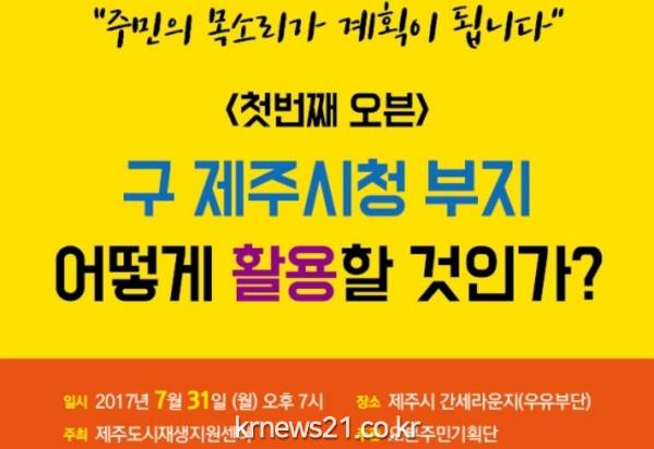 첫 주제는 구 제주시청 부지 활용방안에 대한 이야기들을 나눈다. 주민들과 전문가 등이 참석해 각자의 생각을 꺼내 놓고 공유하는 자리로 마련된다.