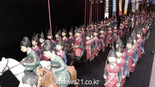 ▲ 전주의 역사·문화 한 눈에이에 앞서, 시는 전통문화중심도시로서의 위상을 높이고 전주한지의 우수성을 홍보하기 위하여 지난 2008년부터 2년간 ‘태조어진 봉안행렬 반차도 재현사업’을 추진, 경기전 내 어진박물관에 상설전시를 통해 관람객들에게 볼거리 제공에 기여한 바 있다. 사학자와 한국학중앙연구원의 고증을 받아 조선시대 의복과 물품을 사실적으로 작품에 담아온 양미영 작가는 “외규장각 의궤는 한지에 기록된 뛰어난 조성왕실 기록으로 이를 전주한지 인형으로 재현해 소개하고 싶었다”라며 “외규장각 의궤가 프랑스에서 5년 단위 임대 형식으로 돌아왔는데 완전한 반환에 보탬이 되었으면 하는 마음에서 작품을 제작했다”고 말했다.