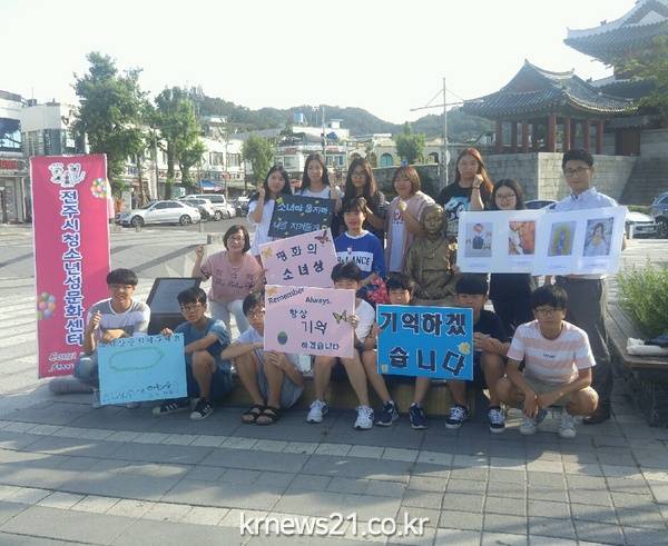 전주시청소년성문화센터는 1일 전주 기억의 광장(풍남문 광장) 평화의 소녀상 앞에서 직원 및 청소년 30여명이 참여한 가운데 평화의 소녀상 알리기 캠페인을 전개했다. 이 캠페인은 전주시청소년성문화센터가 여름방학을 맞은 청소년을 대상으로 실시한 ‘일본군 위안부 바로 알기’ 활동에 참여했던 청소년들이 주체가 돼 진행된 행사로, 참석자들은 소녀상에 대한 묵념 및 헌화를 시작으로 시민들을 대상으로 평화의 소녀상 알리기에 나섰다. 또한, 청소년들은 위안부 할머니들의 아픔에 공감하고자 소녀상 바로 옆 자리에 앉아 정성들여 써온 편지글을 낭독하며 평화의 소녀상에 담긴 의미를 되새김으로써 올바른 역사관과 가치관을 정립하는 시간이 됐다.