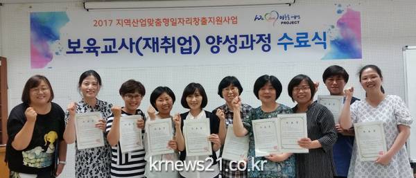 이 사업은 보육교사 자격증을 소지한 경력단절여성들을 대상으로 보육교사의 역할, 보육현장 이해, 주제별 혼합연령프로그램개발 등을 교육, 수료생 전원이 ‘동화구연지도사’ 자격증을 취득했다.