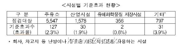 지난해 기준 초과시설을 유형별로 보면 주유소가 127곳으로 가장 많았고 산업시설 30곳, 유해화학물질 저장시설 2곳 등의 순으로 나타났다.