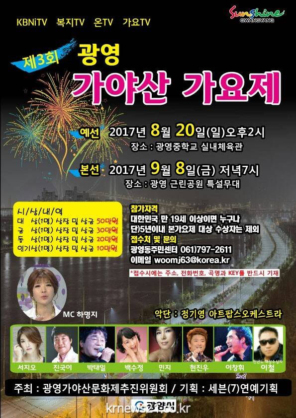 9월 8부터 10일까지 3일간 개최되는 ‘제15회 광영 가야산 문화제’를 장식할 하이라이트로 마련된 이번 행사는 KBNiTV MC인 하명지 진행으로 열린다.